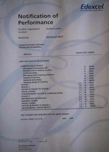 In 1998 I took tim out and study HND in Model making